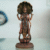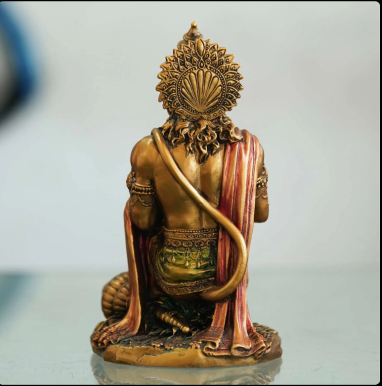 A small statue depicting the Hindu deity Hanuman, sitting in a devotional pose. The statue is made of copper and has a polished finish. Hanuman is a monkey god who is known for his strength, devotion, and intelligence. He is a popular figure in Hinduism and is often worshipped for his ability to protect from evil and bring good luck.