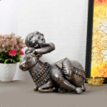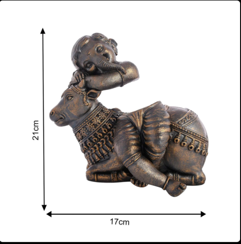This image showcases a handcrafted brass statue depicting a cow with a baby Krishna resting on its back. The statue features intricate detailing, including a raised relief of Ganesha on the cow’s back.