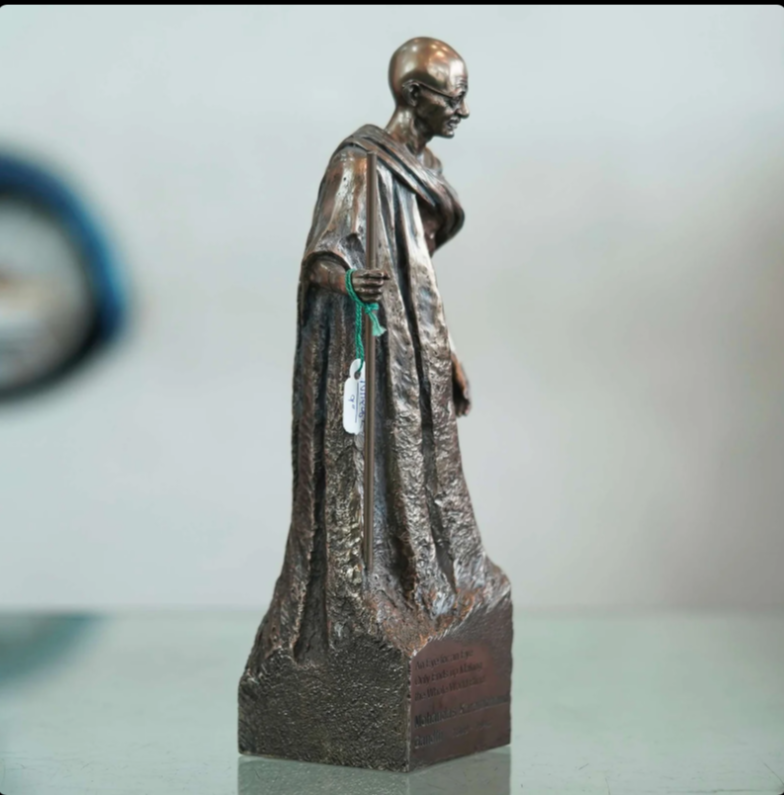 This decorative statue depicts Mahatma Gandhi, the iconic leader of the Indian independence movement and champion of non-violent resistance. The statue is made of a material colored to resemble copper and features Gandhi standing in a peaceful pose, draped in his signature dhoti. Below the statue is a quote attributed to Gandhi: “An eye for an eye makes the whole world blind.” This statue is a powerful symbol of peace, justice, and equality.