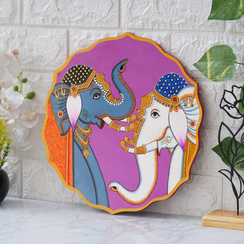 Two Elephants?. It is a hand-painted picture on a wooden plate, and it depicts two elephants standing next to each other. The elephants are painted in intricate detail, and they are adorned with colorful jewelry. The background of the painting is purple, and there is a border of flowers and vines around the edge.