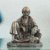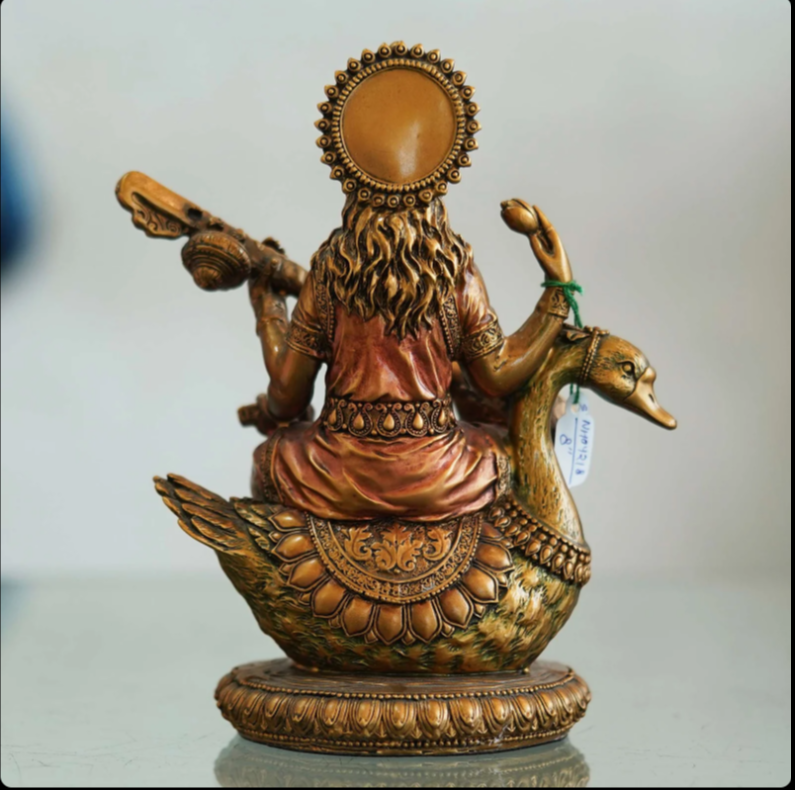 This image depicts Saraswati, the Hindu goddess of knowledge, music, arts, and wisdom. She is seated on a white swan, playing a veena, a stringed instrument. She is adorned with jewelry and draped in white and red.